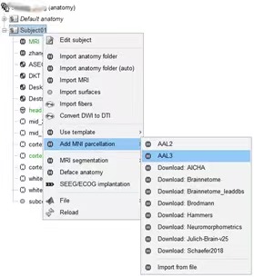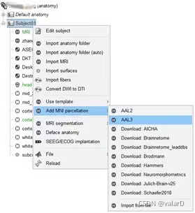 在brainstorm里,可以很方便地查看各类大脑分区信息,freesurfer已为我们提供Deskian-Killiany、Destrieux等多种native坐标系下的分区信息,右键Subject-Add MNI parcellation,下载基于MNI空间的分区信息,在之前的步骤中我们已将图像注册到标准MNI空间,这些分区信息将基于此与图像对应,在这里我们下载AAL3分区