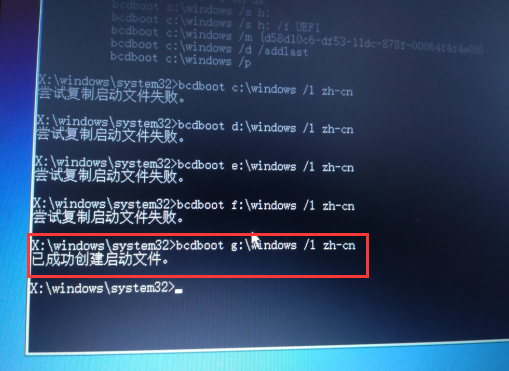 输入该命令后,出现尝试复制启动文件失败的错误,于按照别人的博客来说,是不会出现这个错误的,因为他们已经有了成功截图,所以说我的错误应该和他们有些不一样。于是百度了下本语句的作用,大概为从系统盘C:\Windows目录中复制启动文件,并创建BCD(中文)启动菜单,从而修复系统启动环境。也就是说本条语句是针对C盘出错的,而我这里C盘应该是没问题了,那其他盘呢,于是我把盘符C依次改为其他盘符,如下所示,最后改为g盘时,成功创建启动文件,这说明我的g盘出现了一些问题,需要修复。