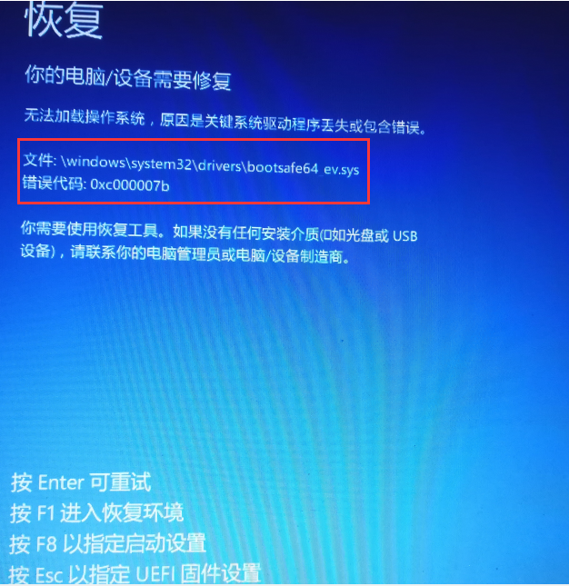 如上图所示,注意红色方框内的路径文件,既然是该文件报错,那我们尝试把该文件删除,首先点击F1进入恢复环境,然后选择键盘布局为微软拼音,