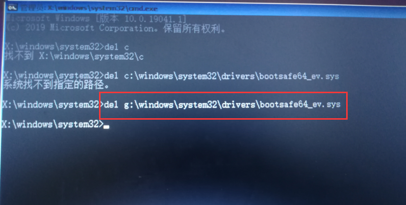 进入命令行后,因为我们是g盘中的windows\system32\drivers\bootsafe64_ev.sys文件,所以命令应为
