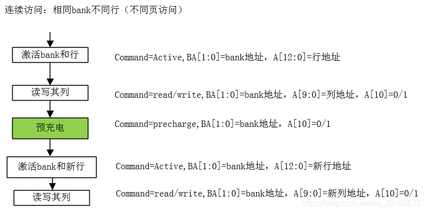 如果想操作同Bank中的另外一个Row,必须使用Precharge关闭当前工作Row,然后再active目的Row,这样才能R/W