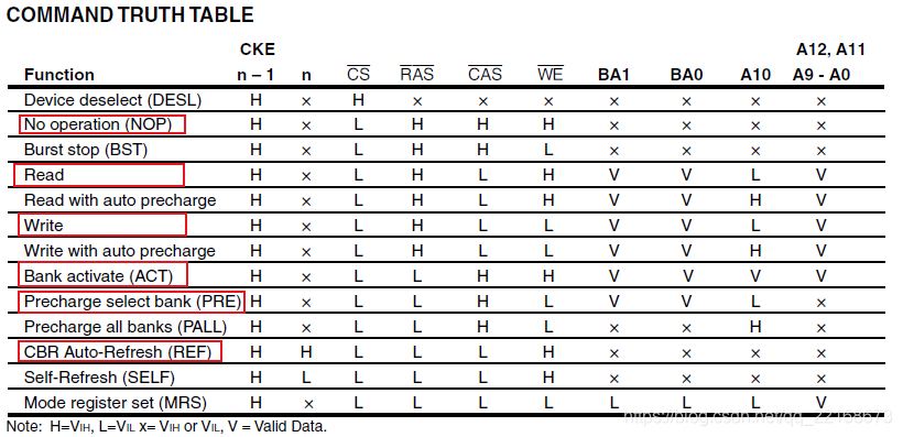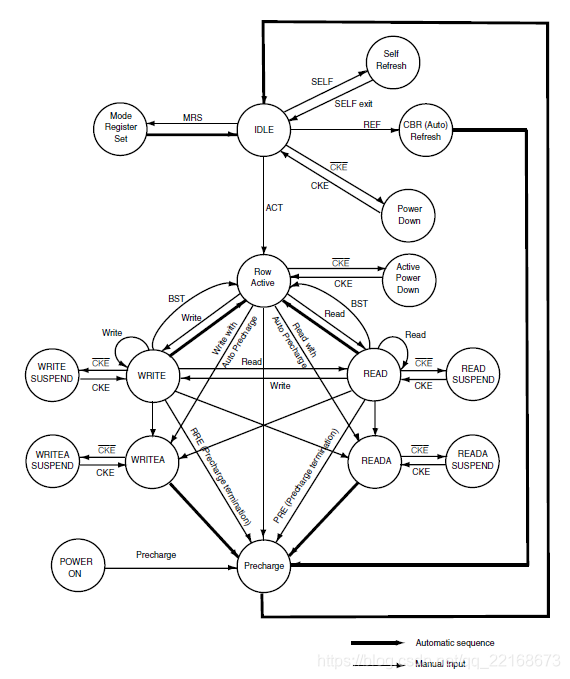 下图中第一个指令Precharge,其作用是关闭当前行/所有行,即是在当前行/所有行关闭的情况下,才能执行刷新AutoRefresh操作。