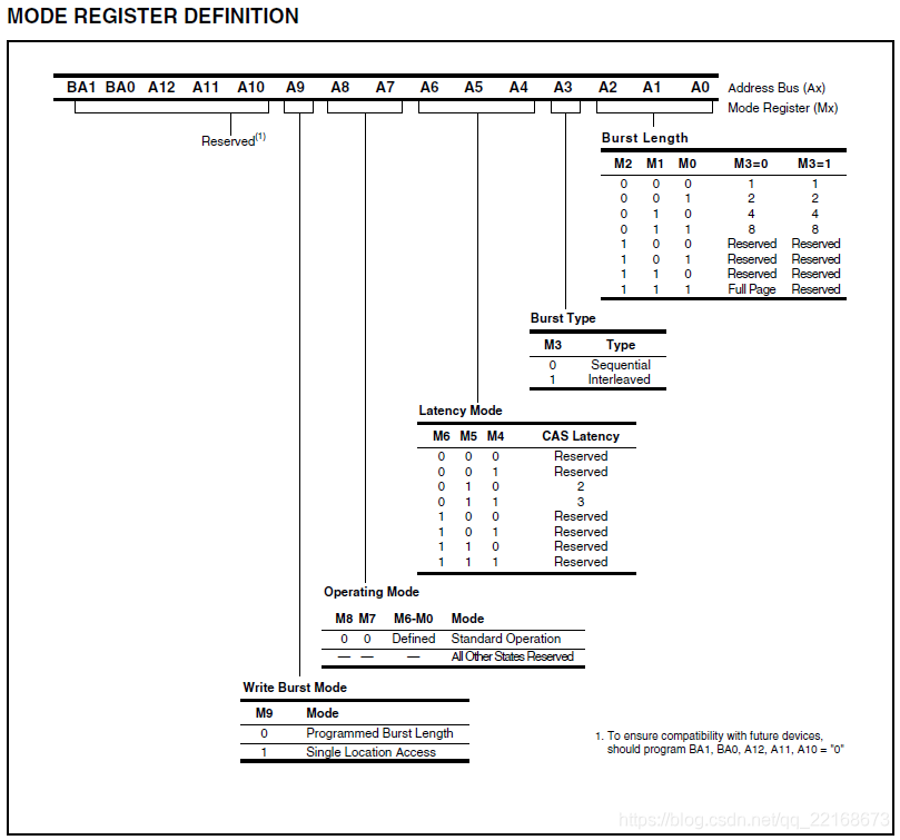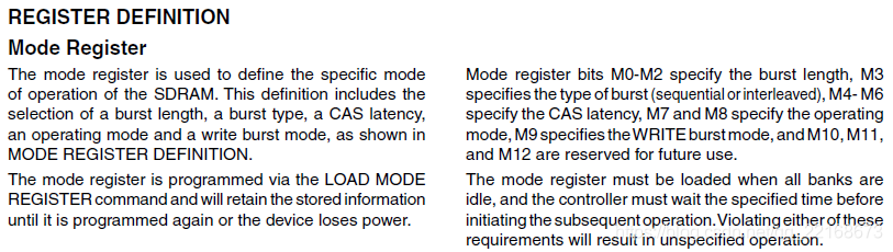 通过配置模式寄存器,来配置SDRAM的:突发长度(burst length,BL)、突发类型、潜伏期(CAS Latency, CL)、操作模式、写突发模式。