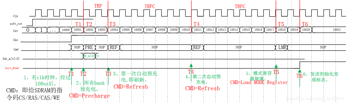 - 在复位结束、有时钟clk信号开始后,计时T1、即经历100us后,发送nop命令码;