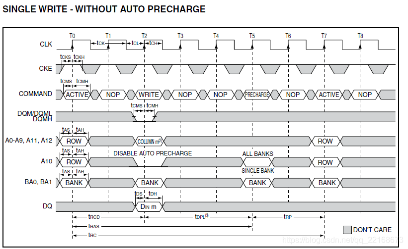 手动Precharge在最后一个有效数据(LVD)后tWR/tDP时间的时钟上升沿发出,或者在Precharge同时使能DQM屏蔽掉同时刻写入的数据。