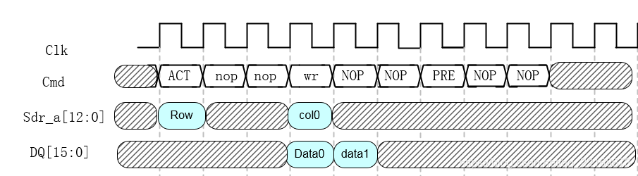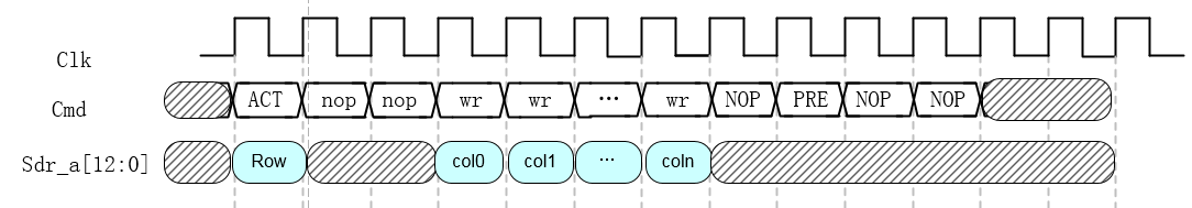 在BL突发模式设置为1的情况下,可以按下面的时序,实现连续的写访问(必须是在SDRAM的同一行(同一页)访问)。