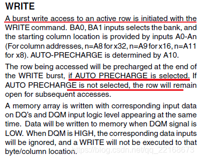 带AutoPrecharge时:在R时,芯片自动在(最后一个有效输出数据)前(CL-1)个时钟时产生Precharge命令。在W时,芯片自动在(最后一个有效输出数据)后(Twr)时间产生Precharge命令。