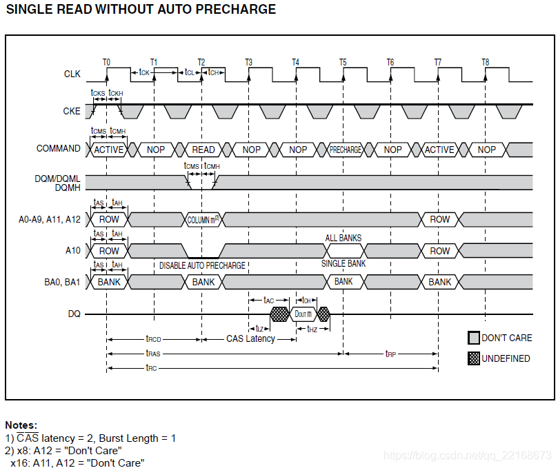 - 所有bank预充电。在T1的下一个clk上升沿来临时、即在T2时刻,发送Precharge命令码,Sdr_a[10]=1拉高。。