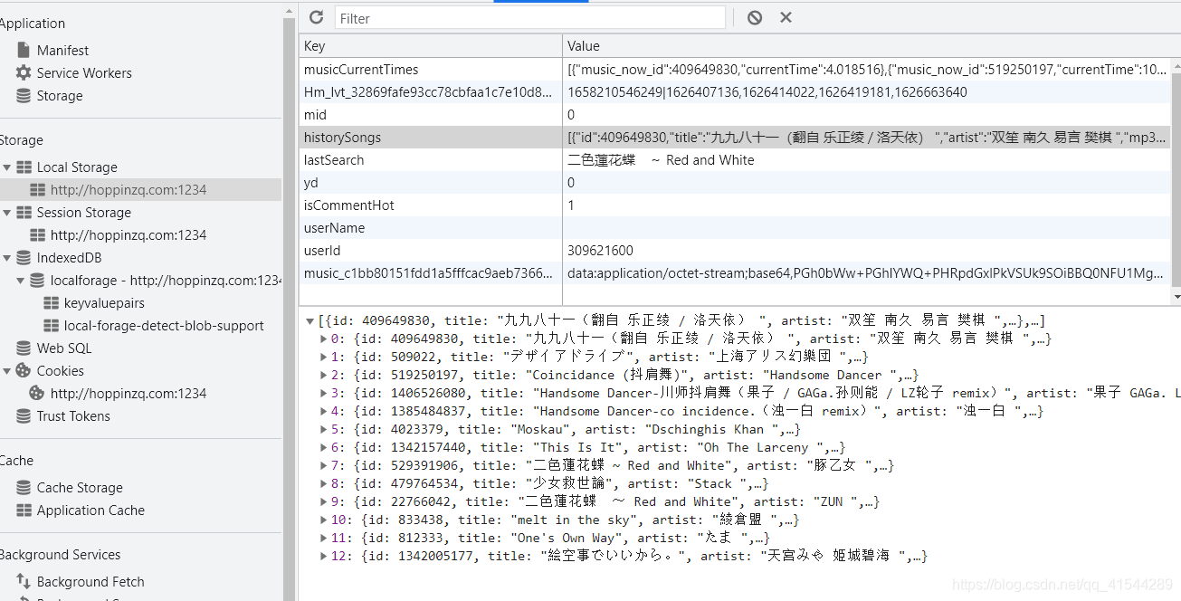 if (typeof(Storage) !== "undefined") { //浏览器支持Storage或隐私模式吗?if (localStorage.getItem("historySongs")) { //先看看历史歌单的键值是否已创建historySongs = JSON.parse(localStorage.getItem("historySongs")); } else { //历史歌单不存在时,一般用户第一次进到你页面(或者请过缓存)肯定不存在,所以需要加这个判断historySongs = [];}var isE = false;//这里是判断在听的歌曲是否包含在历史歌曲里,不用管for (let historySong of historySongs) {if (historySong.id === music_id) {isE = true;break;}}if (!isE) {historySongs.push(e.jPlayer.status.media);localStorage.setItem("historySongs", JSON.stringify(historySongs));//设置历史歌曲}