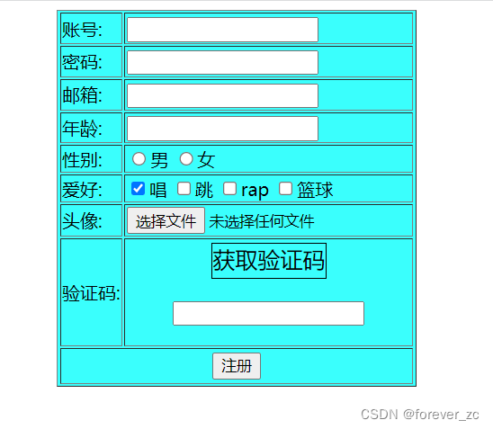 <form action="" method="get" ><table align="center" border="1px solid black" style="background-color: #3afffd"><tr><td>账号:</td><td><input type="text" name="username" required></td></tr><tr><td>密码:</td><td><input type="password" name="password" required></td></tr><tr><td>邮箱:</td><td><input type="email" name="emails" required></td></tr><tr><td>年龄:</td><td><input type="number" name="ages" required></td></tr><tr><td>性别:</td><td><input type="radio" name="sex" value="男">男<input type="radio" name="sex" value="女">女</td></tr><tr><td>爱好:</td><td><input type="checkbox" name="hobby" checked value="sing">唱<input type="checkbox" name="hobby" value="jump">跳<input type="checkbox" name="hobby" value="rap">rap<input type="checkbox" name="hobby" value="Basketball">篮球</td></tr><tr><td>头像:</td><td><input type="file"></td></tr><tr align="center"><td>验证码:</td><td><button onclick="btnClick();" style="border: 1px solid #3afffd;background-color: #3afffd"><div id="div1">获取验证码</div></button><p><label for="cg"/><input type="text" id="cg"></p></td></tr><tr align="center"><td colspan="2"><button onclick="btClick();" style="border: 1px solid #3afffd;background-color: #3afffd"><input type="submit" value="注册"></button></td></tr></table>