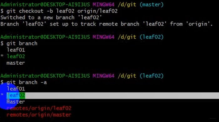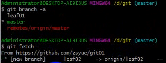 git fetch 从远程仓库里拉取最新的版本信息,发现其他人新建的leaf02分支。