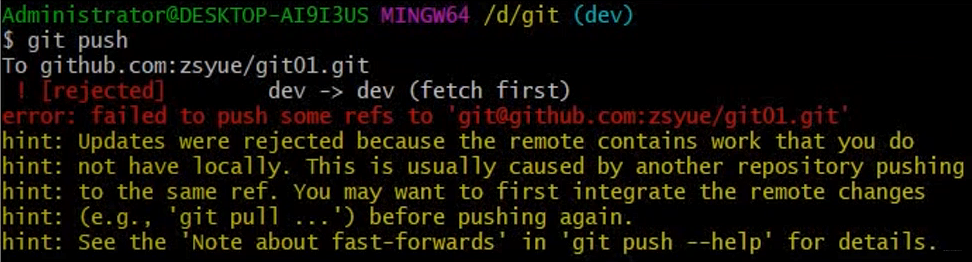 git merge dev 只能在主分支上合并分支,不能在分支上执行这个命令。