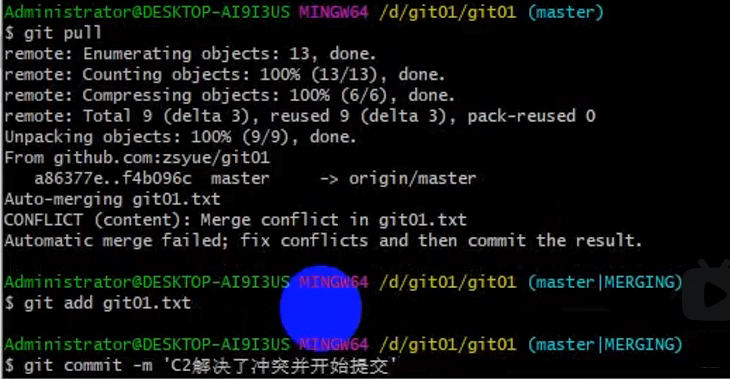 pull下来就已经有冲突了,这时就把冲突文件打开,修改后再add提交,直到去push,如果push失败,再pull拉一遍新代码,在本地修改冲突
