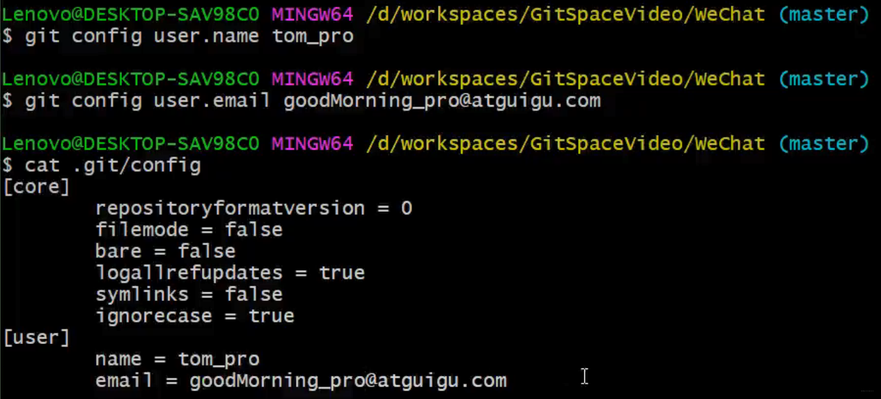 当然,也可以对某个仓库级别(项目级别),指定不同的用户名和Email地址。仓库级别(项目级别)的签名,保存的位置在.git文件夹的config文件内