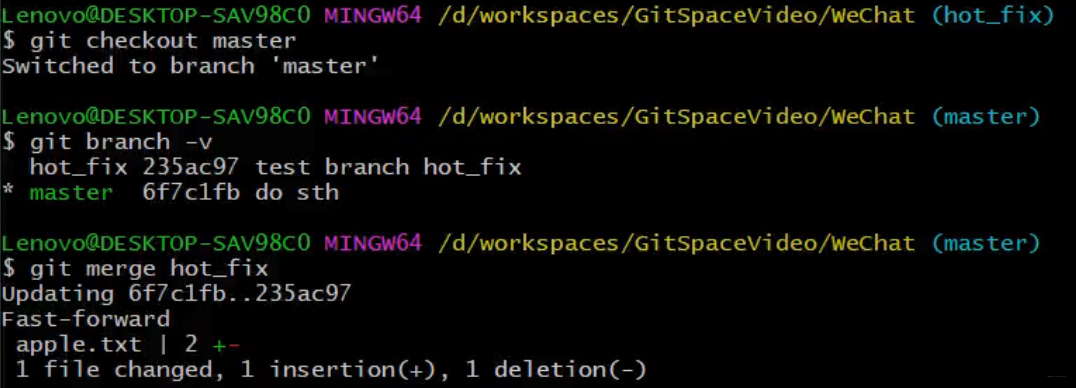 先切换到主分支上 git checkout master ,再执行 git merge hot_fix 操作。