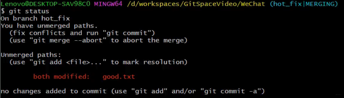 提交本地库后,退出了MERGING模式,表明冲突已经得到解决。