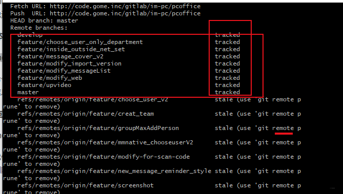 红框中的分支是远程分支还在的分支,stale的是在远端已被删除的分支,