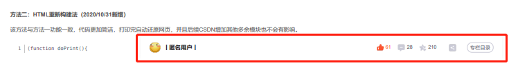该方法与方法一功能一致,代码更加简洁,打印完自动还原网页,并且后续CSDN增加其他多余模块也不会有影响。