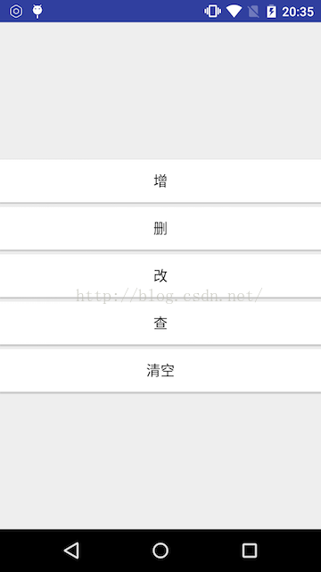 一共有5个按钮,分别对应5增删改查和清空5种操作,其实清空也就是删除所有数据,更新可以更新某个字段,也可以更新所有字段。在onCreate()中获取数据库管理器的实例顺便打开数据库,别忘记在onDestroy()中关闭数据库。