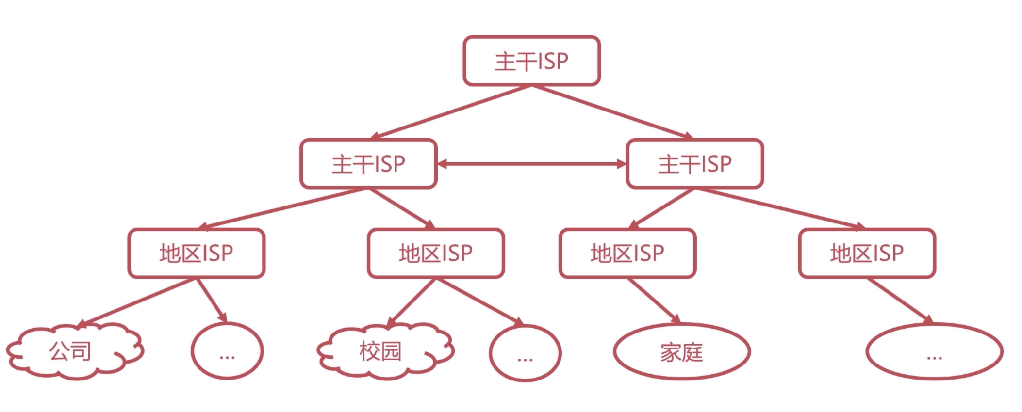 :网络服务提供商,例如中国电信、中国移动、中国联通等。从上之下,由主干 ISP、地区 ISP 组成。