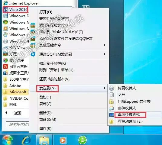 16.在开始菜单栏中找到“Visio 2016”的图标,选中后鼠标右击选择“发送到”接着选择“桌面快捷方式”。