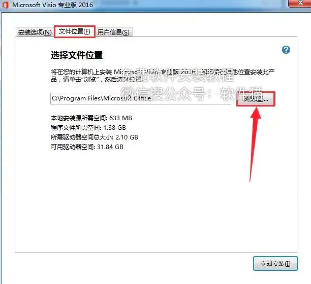 7.在“文件位置”中点击右侧的“浏览”更改软件安装位置,建议安装到除C盘以外的磁盘,可在D盘或其它盘新建一个文件夹Visio。