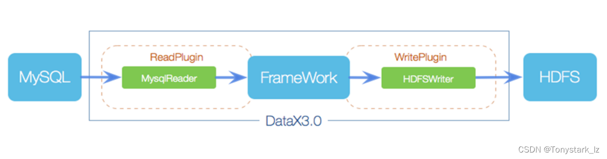 - Framework:用于连接reader和writer,作为两者的数据传输通道,并处理缓冲, 流控,并发,数据转换等核心技术问题。
