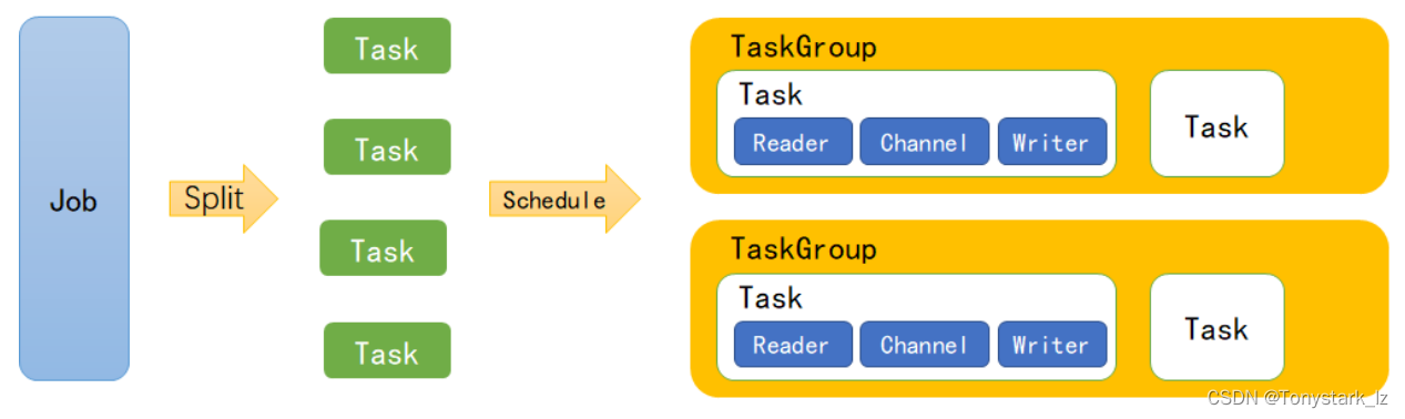 1.Job:单个作业的管理节点,负责数据清理、子任务划分、TaskGroup监控管理。