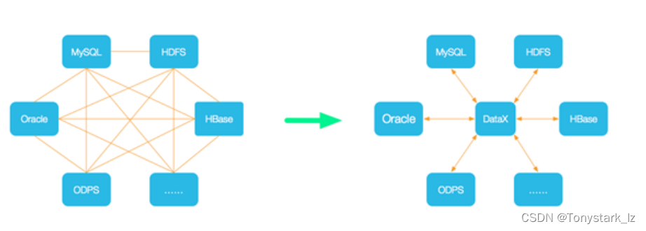 为了解决异构数据源同步问题,DataX将复杂的网状的同步链路变成了星型数据链路,DataX作为中间传输载体负责连接各种数据源。当需要接入一个新的数据源的时候,只需要将此数据源对接到DataX,便能跟已有的数据源做到无缝数据同步。