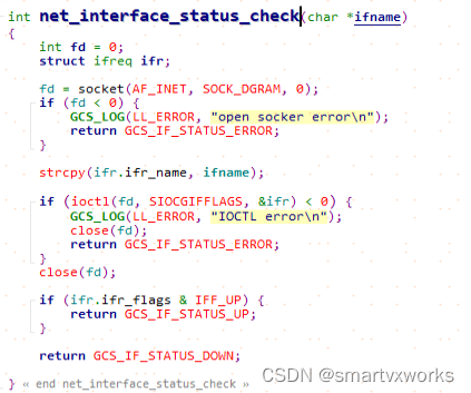 {char buffer[BUFSIZ];char cmd[100];FILE *read_fp;int chars_read; int ret =0;memset( buffer, 0, BUFSIZ );memset( cmd, 0, 100 );sprintf(cmd, "ifconfig -a | grep %s",if_name);read_fp = popen(cmd, "r");if ( read_fp != NULL ){chars_read = fread(buffer, sizeof(char), BUFSIZ-1, read_fp);pclose(read_fp);if (chars_read > 0){ret = 1; /*if_name exist*/}else{fprintf(stderr, "%s: NO FOUND\r\n",if_name);return 0; /*if_name not exist*/}}if(ret == 1){memset( buffer, 0, BUFSIZ );memset( cmd, 0, 100 );sprintf(cmd, "ifconfig | grep %s",if_name);read_fp = popen(cmd, "r");if ( read_fp != NULL ){chars_read = fread(buffer, sizeof(char), BUFSIZ-1, read_fp);pclose(read_fp);if (chars_read > 0){ret = 2; /*if_name exist and up*/}else{fprintf(stderr, "%s: DOWN\r\n",if_name);return 1; /*if_name exist but down*/}}}if(ret == 2){memset( buffer, 0, BUFSIZ );memset( cmd, 0, 100 );sprintf(cmd, "ifconfig %s | grep RUNNING | awk '{print $3}'",if_name);read_fp = popen(cmd, "r");if ( read_fp != NULL ){chars_read = fread(buffer, sizeof(char), BUFSIZ-1, read_fp);pclose(read_fp);if (chars_read > 0){fprintf(stderr, "%s: LINKED\r\n",if_name); return 3; /*if_name up and link*/}else{fprintf(stderr, "%s: UNPLUGGED\r\n",if_name);return 2; /*if_name up and notlink*/}}}return -1;