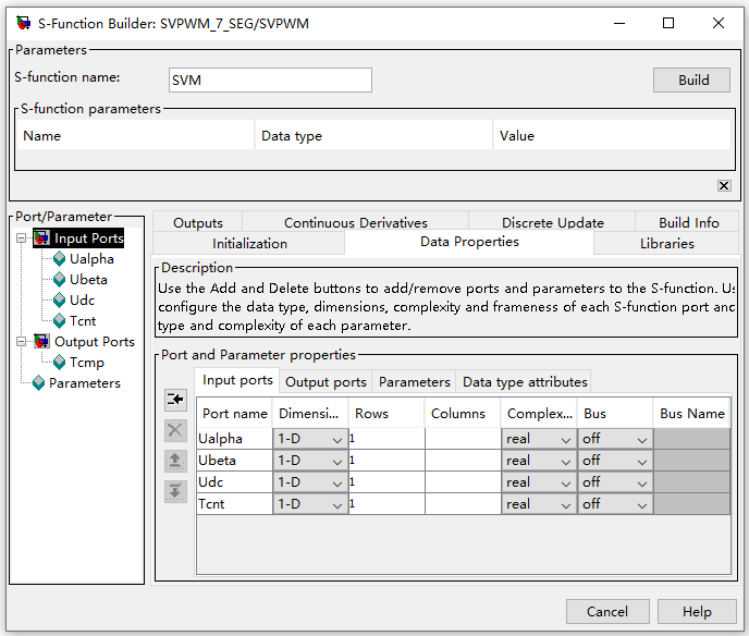 Data Properties选项卡用来设置模块的输入/输出接口。首先选择Input Ports子选项卡进行输入接口设置,分别添加名为“Ualpha”、“Ubeta”、“Udc”、“Tcnt”的4路输入接口,如图1-3所示。然后选择Output Ports子选项卡进行输出接口设置,添加名为“Tcm”的3维度输出接口和名为“Sec”的扇区输出接口,如图1-4所示。