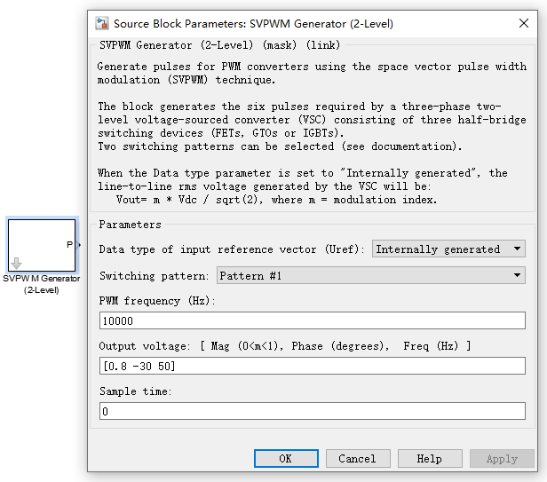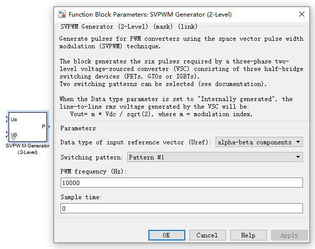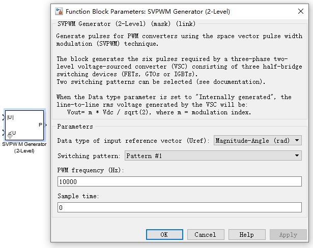 Data type of input reference vector (Uref)(参考电压矢量输入类型)的下拉列表中包括3种类型:Magnitude-Angle (rad)(电压的幅值和相角)、alpha-beta components(静止坐标系下α-β分量)和Internally generated(内部模式)。