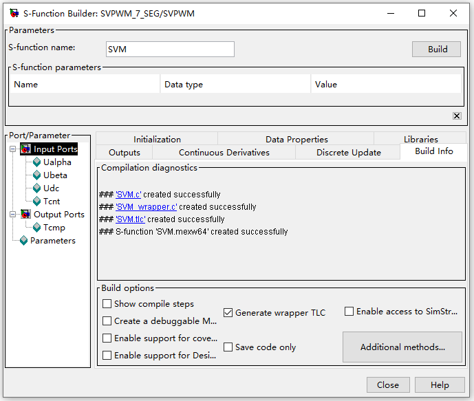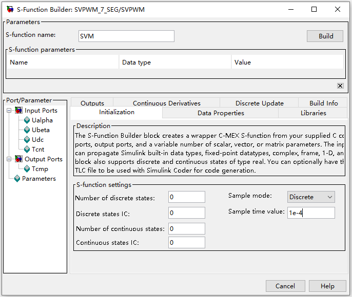双击Sfunction builder模块设置(即图1-1中的SVPWM),首先填写S-function name:SVM,然后在Initialization选项卡中选择Sample mode为Discere,意味着使用离散采样模式,在Sample time value中设置采样周期,这里采用1e-4(单位:秒,这里与PWM开关周期设置为同一时间),如图1-2所示。