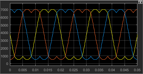 SVPWM输出的6路波形为等幅不等宽的脉冲,其经过低通滤波器滤掉开关频次的谐波后应该呈马鞍波状,取Sa、Sb、Sc三路观测,其相位互差120°,如图1-14所示。