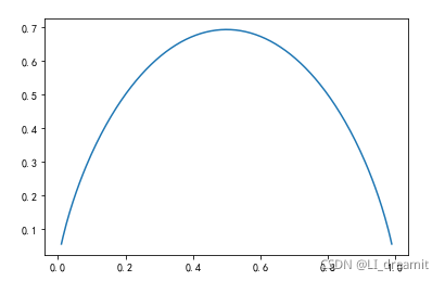 import numpy as np import matplotlib.pyplot as pltdef entropy(p):return -p*np.log(p)-(1-p)*np.log(1-p)x = np.linspace(0.01,0.99,200) plt.plot(x,entropy(x)) plt.show()