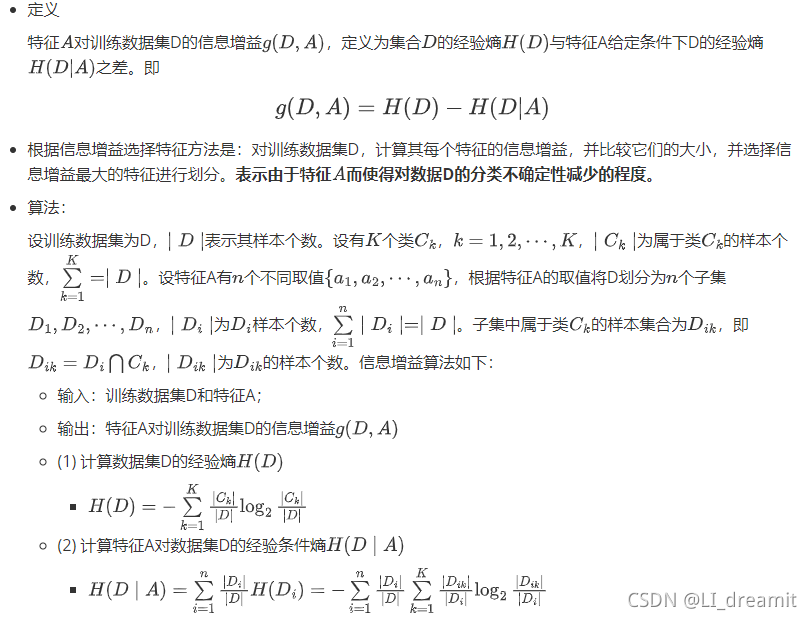 决策树生成:典型的算法有ID3和C4.5,它们生成决策树过程相似,ID3是采用信息增益作为特征选择度量,而C4.5采用信息增益比率。