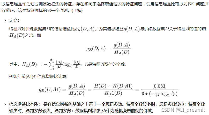 - C4.5使用的是信息增益比来选择特征,克服了ID3的不足。