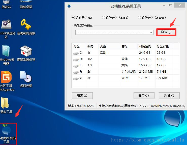 四、进pe系统后,打开桌面上的 “老毛桃PE装机工具” —— 点“浏览”按钮,如下图: