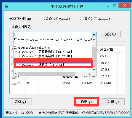 六、在映像文件路径下拉框中选择win7系统的版本, 我们选 “旗舰版”,接着在磁盘分区列表中选择C盘作为系统盘(按照自己原来的系统盘选),然后点击“确定”如下: