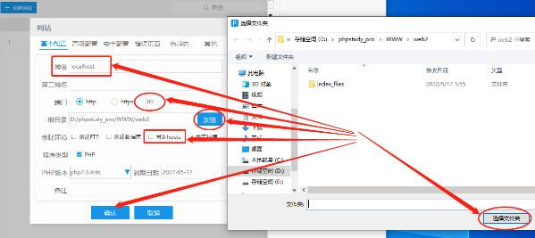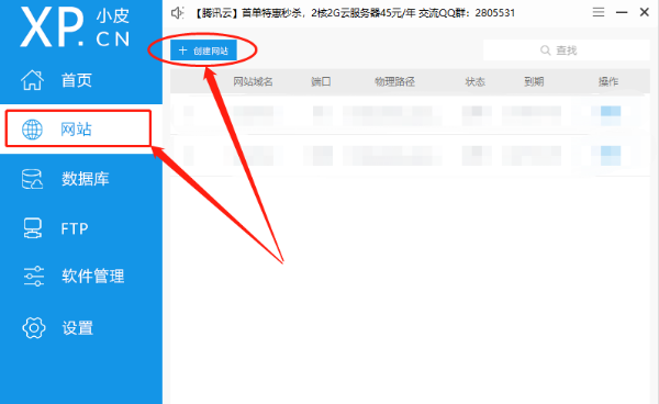 接着回到PHPStudy,在主界面的“网站”页面,选择“创建网站”,并将网页内容指向我们下载好的开源网页文件。