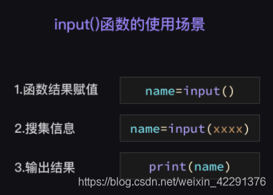 input()函数使用:a.函数结果赋值给变量;b.使用函数,收集信息;c.输出结果。