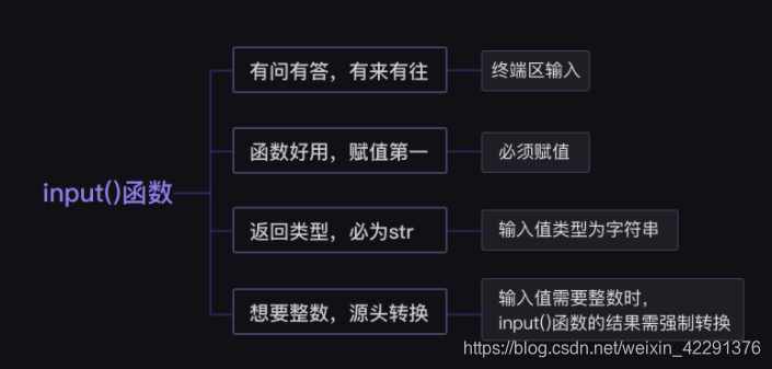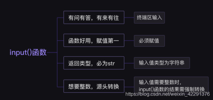 input()函数的数据类型:返回类型,必为str,不管你在终端输入的是整数还是字符串,输入值必为字符串。