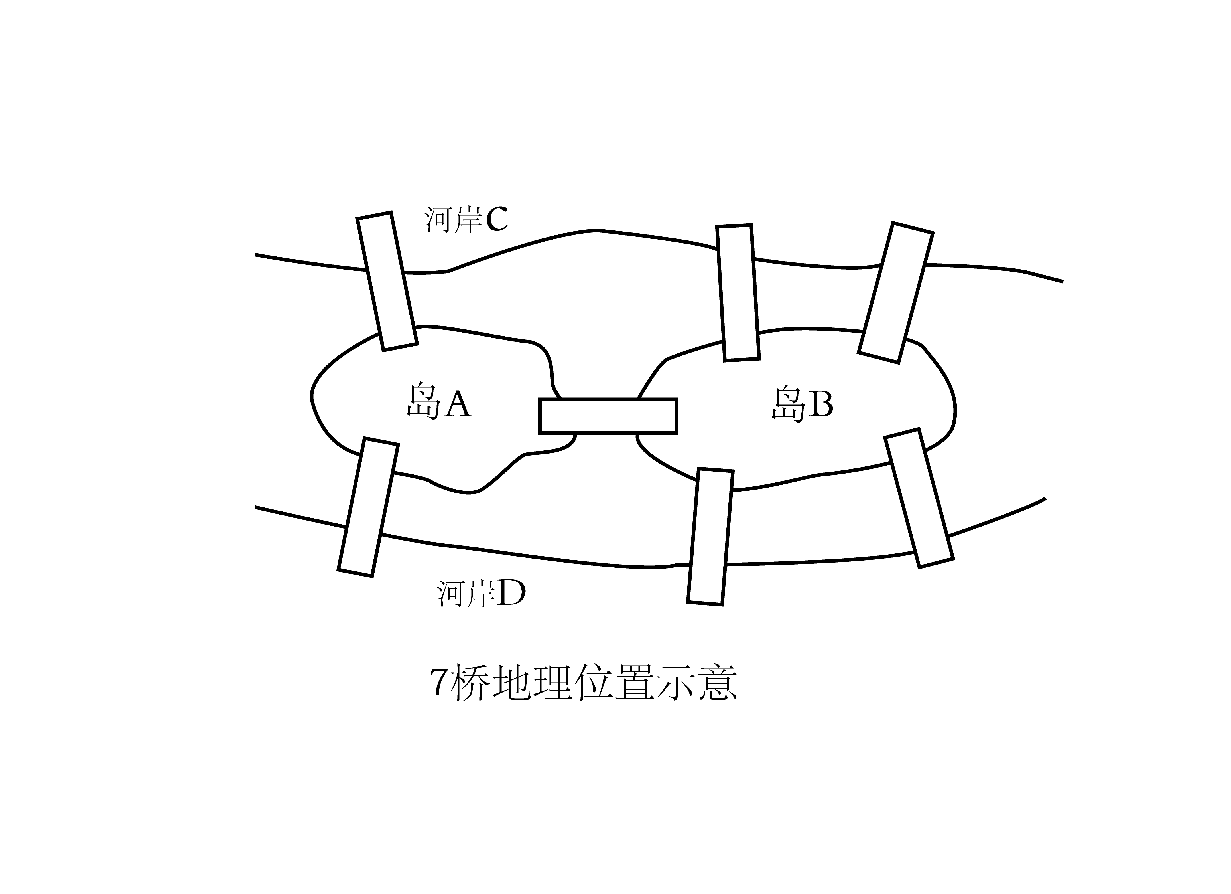 这个问题可抽象为一个如图2所示的数学意义上的图,其中4个结点分别表示与4块陆土Il 对应,如结点C对应河岸C,结点A对应岛A等,而结点之间的边表示7座桥。