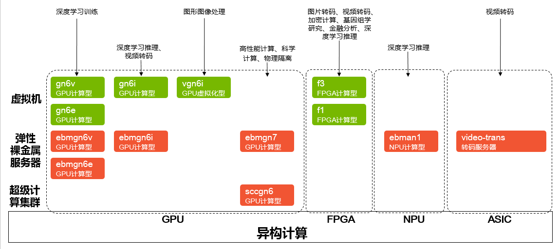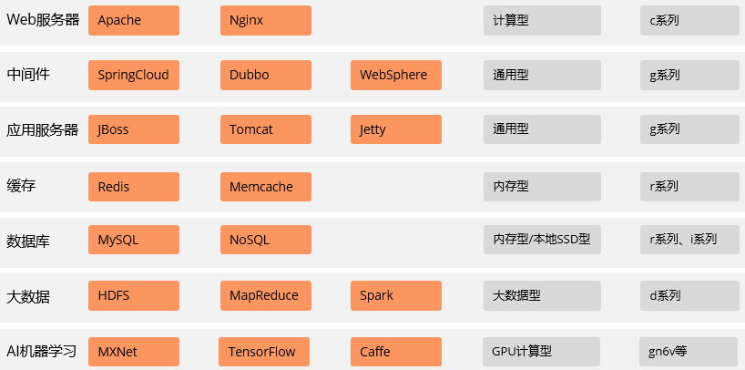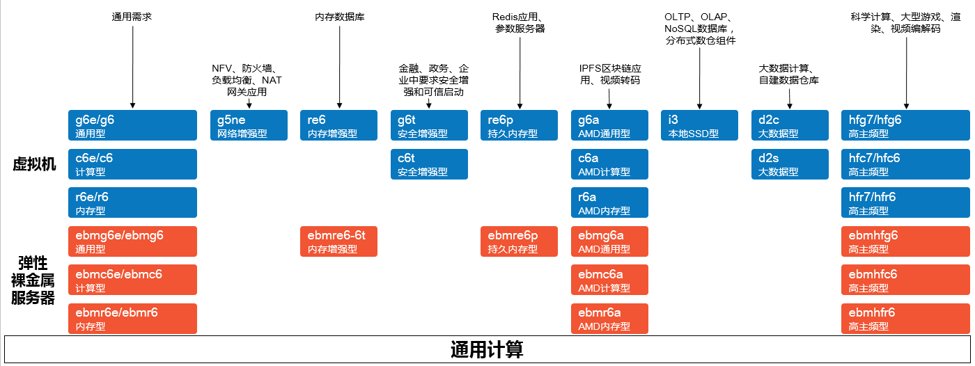 下图显示了阿里云ECS的部分通用计算和异构计算实例规格族及其对应的业务场景