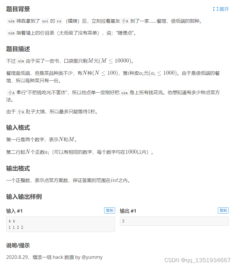此题同上题一样,物品的价值与体积一样,但此问题问的是有多少种方法?在初始状态下有不选这种方法,所以初始化时初始化为1,在核心代码那里只需累加每次方法即可。