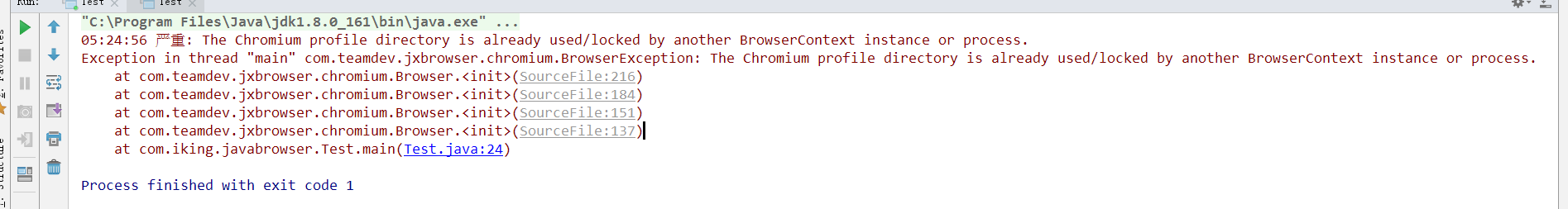 需要注意的是 jxbrowser实例只能存在一个,当再次运行main方法是将会报以下错: