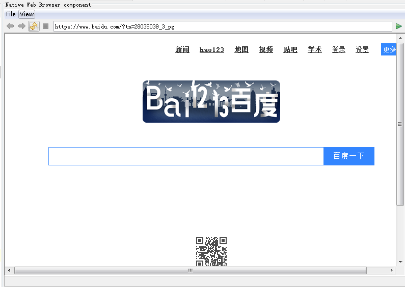 import chrriis.dj.nativeswing.swtimpl.components.WebBrowserEvent;public class Browser2 extends JPanel {public Browser2() {super(new BorderLayout());JPanel webBrowserPanel = new JPanel(new BorderLayout());webBrowserPanel.setBorder(BorderFactory.createTitledBorder("Native Web Browser component"));final JWebBrowser webBrowser = new JWebBrowser();webBrowser.navigate("http://www.baidu.com");webBrowserPanel.add(webBrowser, BorderLayout.CENTER);add(webBrowserPanel, BorderLayout.CENTER);// Create an additional bar allowing to show/hide the menu bar of the web browser.JPanel buttonPanel = new JPanel(new FlowLayout(FlowLayout.CENTER, 4, 4));JCheckBox menuBarCheckBox = new JCheckBox("Menu Bar", webBrowser.isMenuBarVisible());menuBarCheckBox.addItemListener(new ItemListener() {public void itemStateChanged(ItemEvent e) {webBrowser.setMenuBarVisible(e.getStateChange() == ItemEvent.SELECTED);}});buttonPanel.add(menuBarCheckBox);add(buttonPanel, BorderLayout.SOUTH);}/* Standard main method to try that test as a standalone application. */public static void main(String[] args) {UIUtils.setPreferredLookAndFeel();NativeInterface.open();SwingUtilities.invokeLater(new Runnable() {public void run() {JFrame frame = new JFrame("DJ Native Swing Test");frame.setDefaultCloseOperation(JFrame.EXIT_ON_CLOSE);frame.getContentPane().add(new Browser2(), BorderLayout.CENTER);//不显示标题栏,最大化,最小化,退出按钮frame.setUndecorated(true);frame.setSize(800, 600);frame.setLocationByPlatform(true);frame.setVisible(true);}});NativeInterface.runEventPump();}