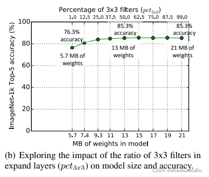 该模块由squeeze layer(只有1x1的卷积核)和expand layer(1x1的卷积核和3x3的卷积核)组成,其中1x1的卷积核的使用是为了减少模型的参数,对应于第1个策略;该模块设置了3个超参数,