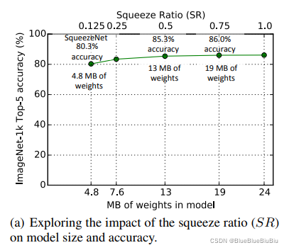 该实验将提出的SqueezeNet与AlexNet,以及经过不同压缩方法的AlexNet进行相比,实验证明使用SVD的方法对AlexNet进行压缩,能够减少5倍的参数,使用Network Pruning方法,能够减少9倍的参数,且保持精度不变;使用Deep Compression的方法能够减少35倍的参数,并保证模型精度;与AlexNet相比,提出的SqueezeNet的参数减少了50倍,并且有一定的精度提升;与压缩后效果最好的AlexNet相比,依然减少了1.4倍的参数。
