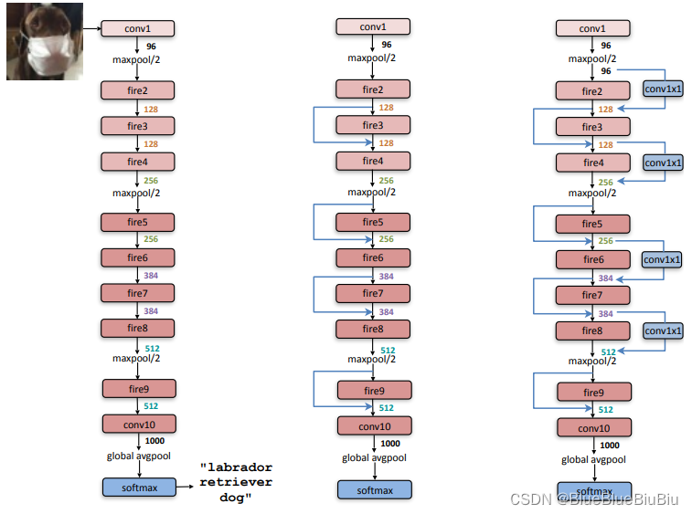 SqueezeNet网络如图的最左侧,首先从1个标准卷积层开始,后续为连续的8个Fire Module,最后以1个标准卷积层结束,并逐渐增加通道数;在conv1、Fire4、Fire8和conv10处使用步长为2的Maxpooling进行降采样,这对应了第3个策略,将降采样应用于网络后半部分,提升网络性能。